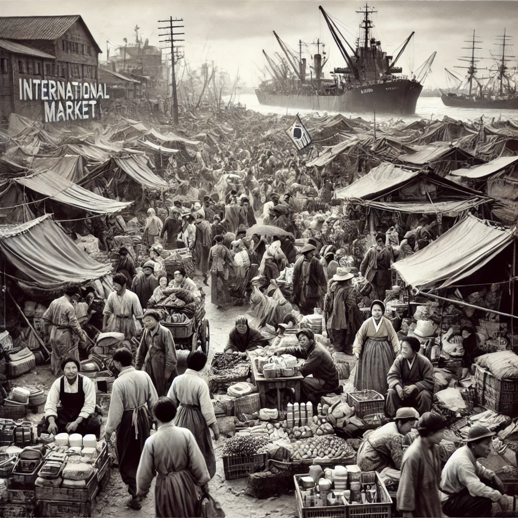 혼란스러운 가운데 국제 시장이 형성되기 시작했습니다. 난민들이 음식, 의복 등 필수 물품을 교환할 수 있는 임시 시장으로 시작된 것이 빠르게 일상생활의 중요한 부분이 되었습니다. 모든 것을 잃은 많은 난민들은 처음부터 다시 삶을 재건해야 했습니다. 시장은 한국 역사상 가장 어려운 시기 중 하나였던 시기에 그들에게 목적의식을 부여하고 경제적 기회와 지원적인 커뮤니티를 제공했습니다.